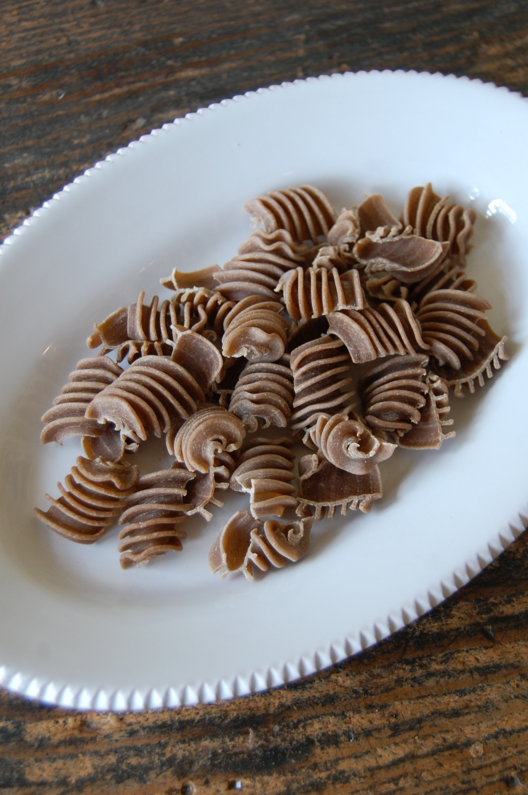こちらはフランス・オーヴェルニュ地方産セップ茸(=ポルチーニ)のパウダーを練りこんだショートパスタ。全粒粉ではなく精製小麦のパスタです。クリームソースやお肉料理の付け合わせに。パスタサイズは長さ約2.5cm、幅約2cm。標準茹で時間7分。