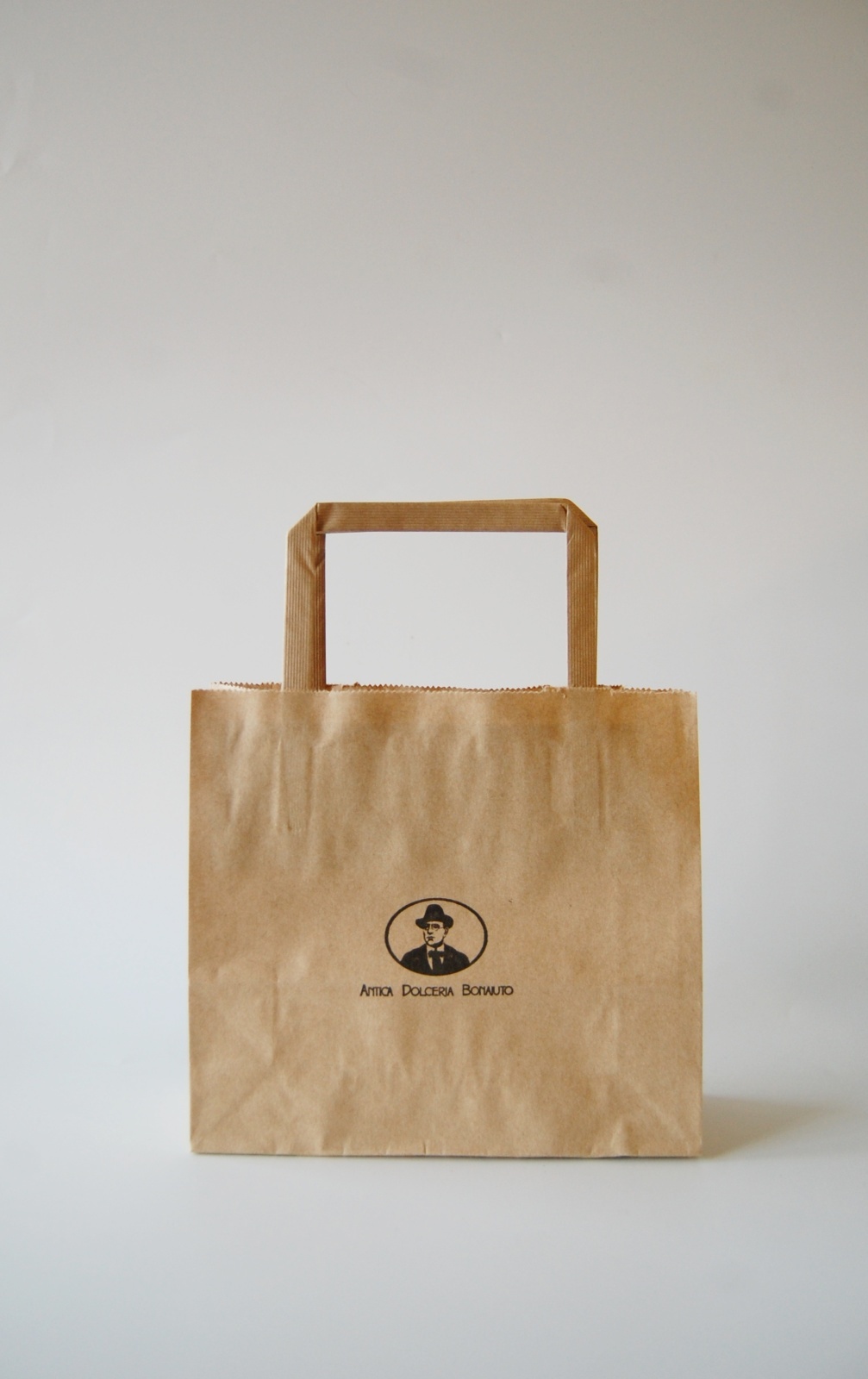 アンティカ・ドルチェリア・ボナイユートの商品専用の紙の手提げ袋です。お店のロゴ入りです。サイズは縦16cm×横18cm×マチ6cm。ボナイユートの全ての商品が入るサイズです(ホットチョコレート240g入りは除きます)。板チョコ50gサイズの場合だと6枚程度まで入ります。