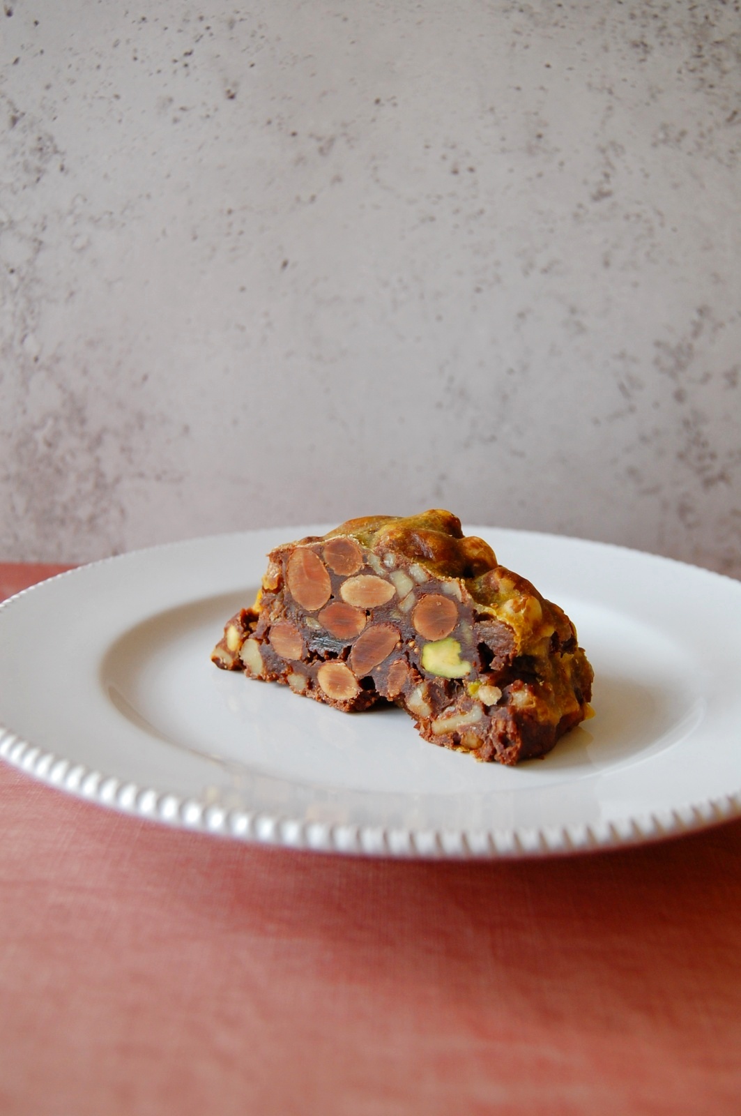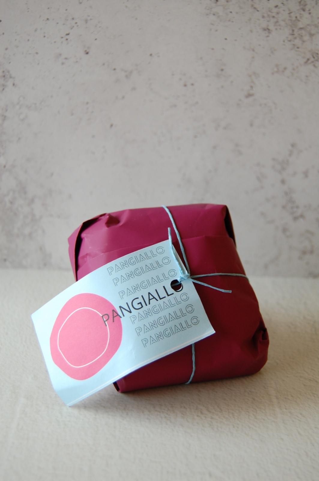 こちらはそのBIANCAさんが作る、パンジャッロ。パンジャッロ(Pan giallo)は「黄色いパン」という意味のローマの伝統的なクリスマスの焼き菓子です。サフランで色を付けた水を生地の表面にぬって黄色くしていることが由来だとか。直径約7cm、高さ約5cmと見た目は小ぶりですが、小麦粉と蜂蜜で作られる生地にアーモンド、ヘーゼルナッツ、クルミ、ピスタチオ、レーズン、イチジク、チョコレートなどがこれでもかと詰まっていて食べ応え抜群。どっしりとした生地にナッツのぎっしり感とシナモンやクミンのスパイス加減も絶妙で、忘れられない美味しさです。